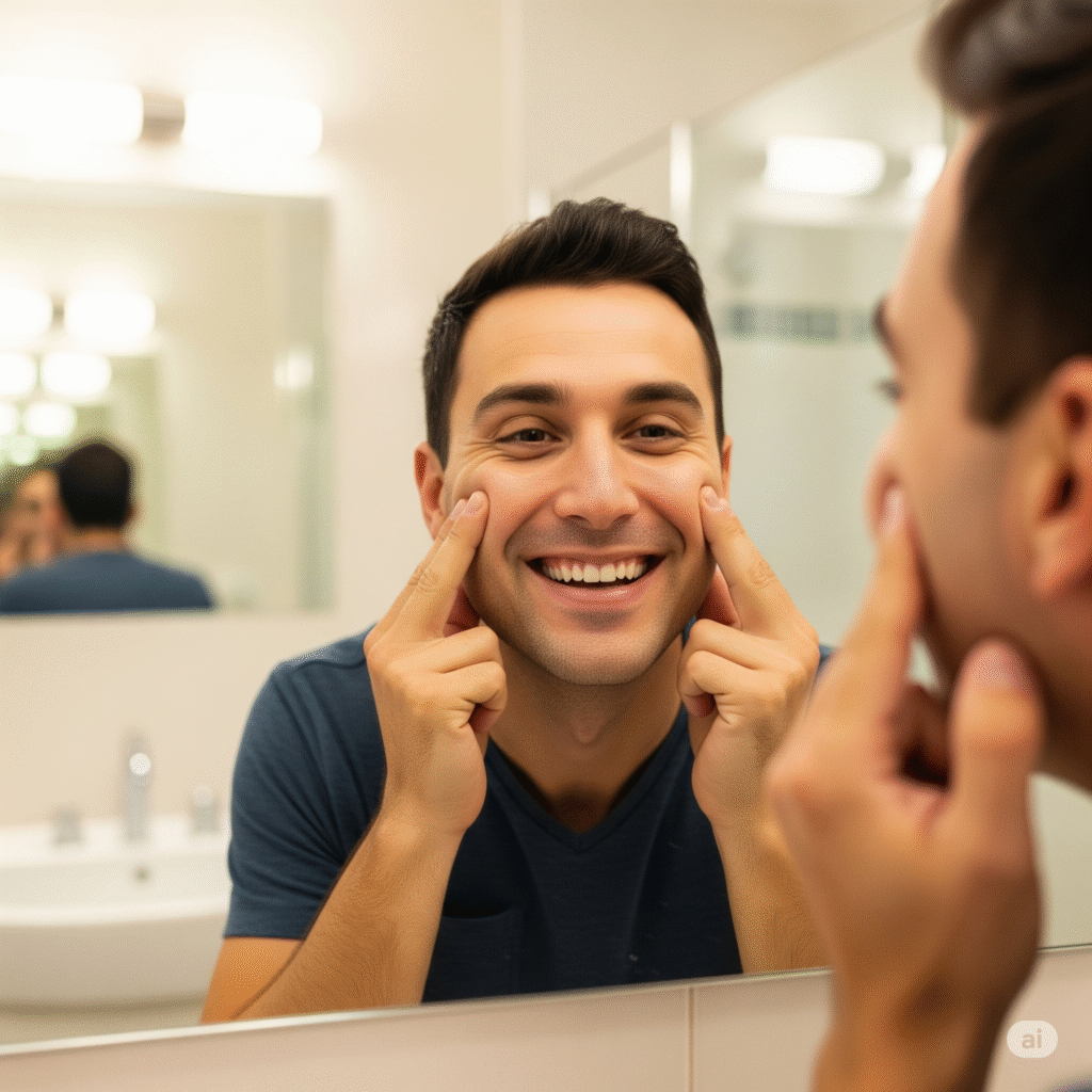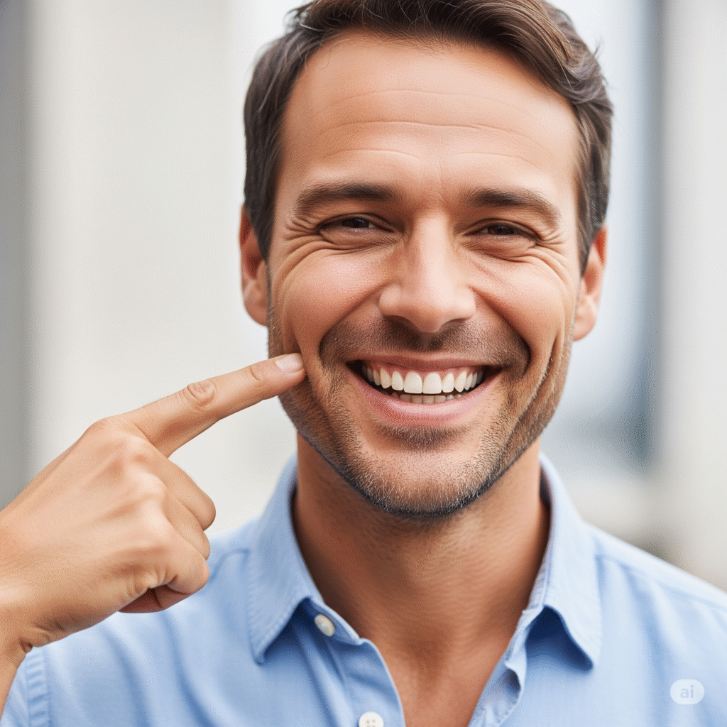 Imagery Idea: Close-up of a smiling man pointing to his cheek muscles. Light, airy background.