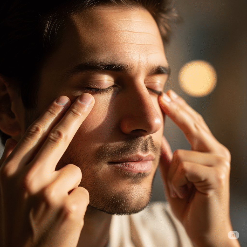Imagery Idea: Close-up of a man gently massaging under his eyes in natural light.